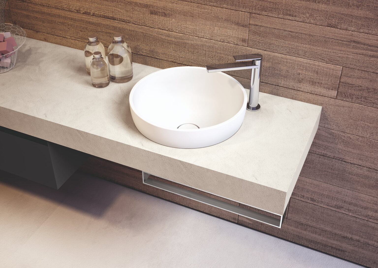 Aquatek washbasins are made of approx. 2/3 aluminium hydroxide and 1/3 high-quality acryl. Aquatek is non-porous and homogeneous throughout its thickness. It retains its shape and is highly resistant to impacts, heat and common chemicals. Scratches and stains can be easily removed with the abrasive sponge provided.