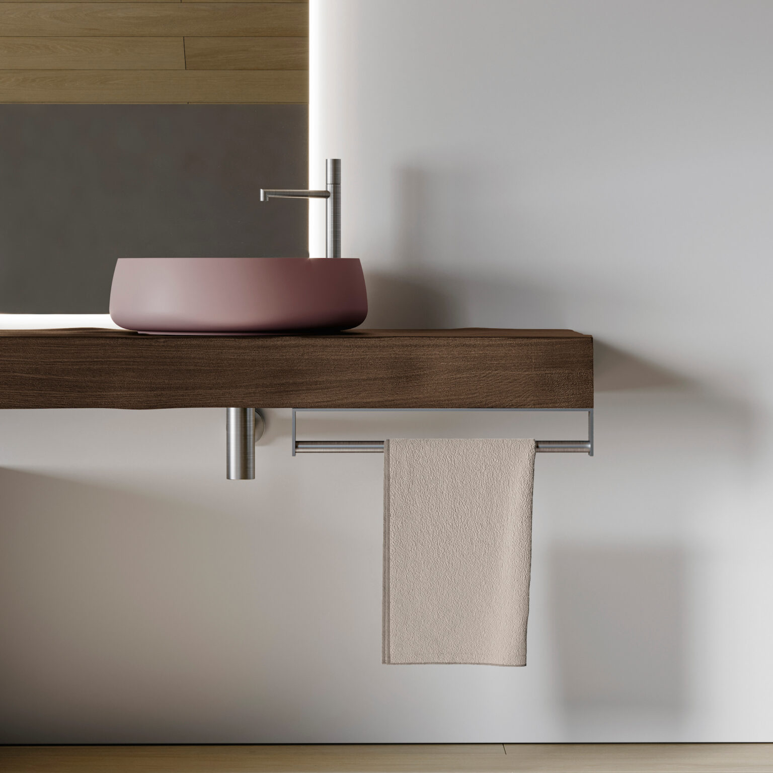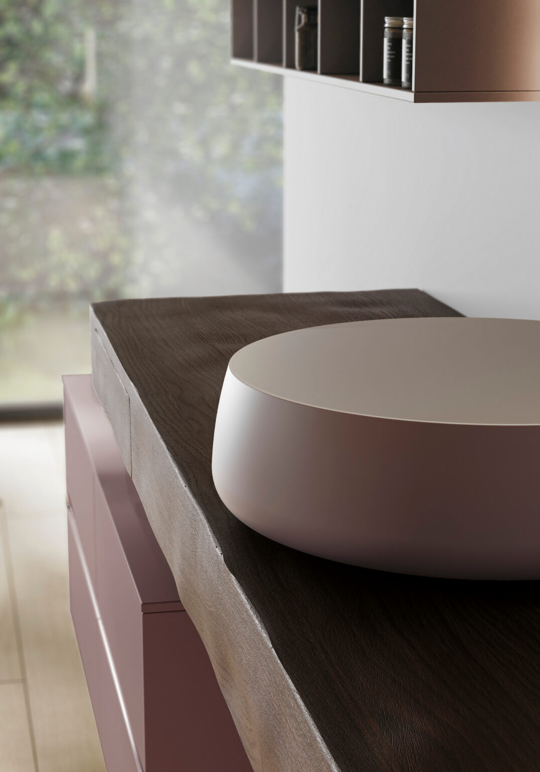Beauty Cristalplant® countertop washbasin. Available matt white, coloured on the outside, or coloured both inside and outside in any matt and Metal colour in the Ideagroup palette (the Metal Color finish can only be applied to the exterior). Without overflow. Suitable for 36 and 45.5 cm deep straight countertops.