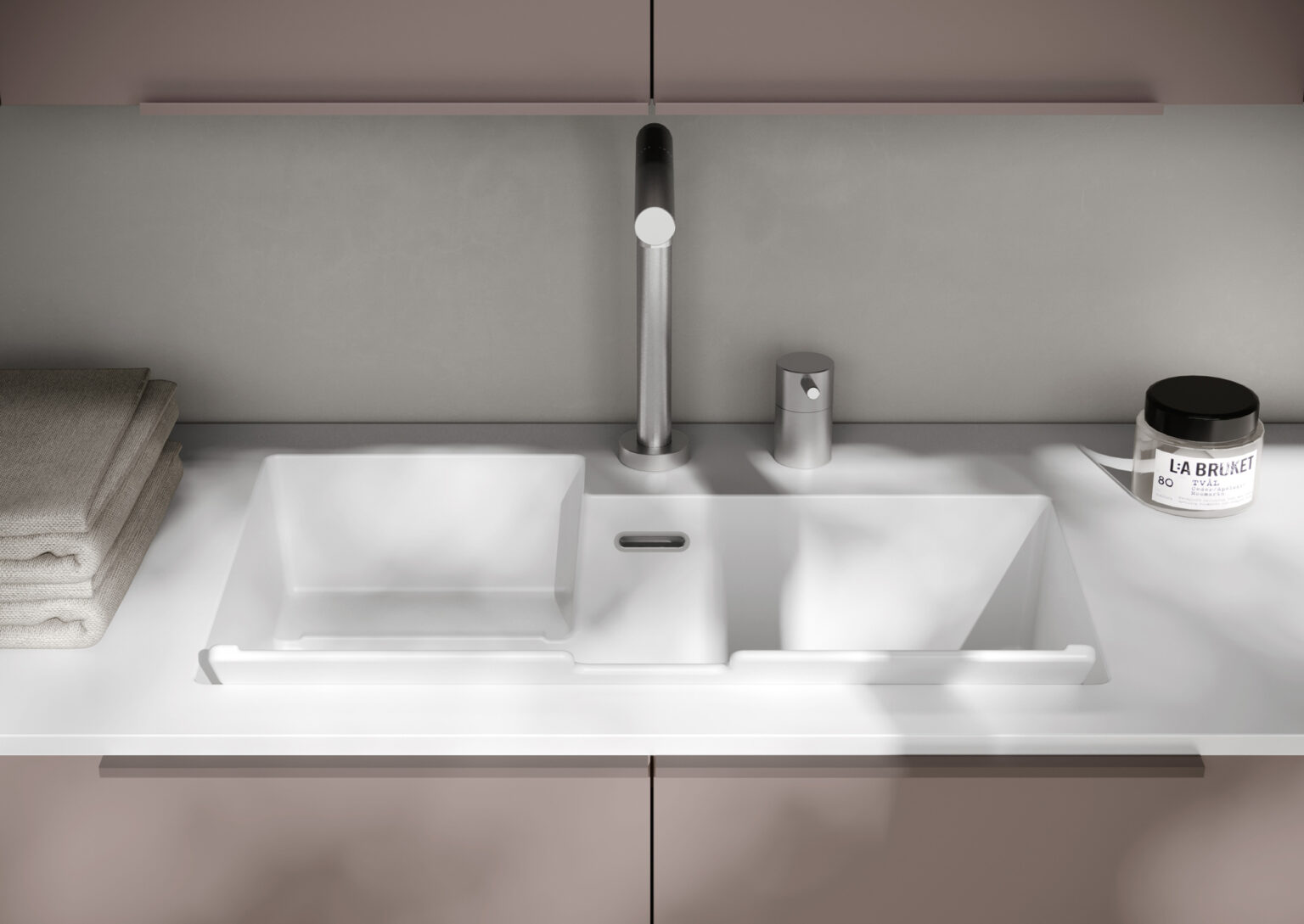 Mineralsolid/Mineralux laundry sinks are made of natural minerals (calcium carbonates and aluminium trihydrates) and polyester resins, with a polyester acrylate gelcoat surface that gives them a matt finish.