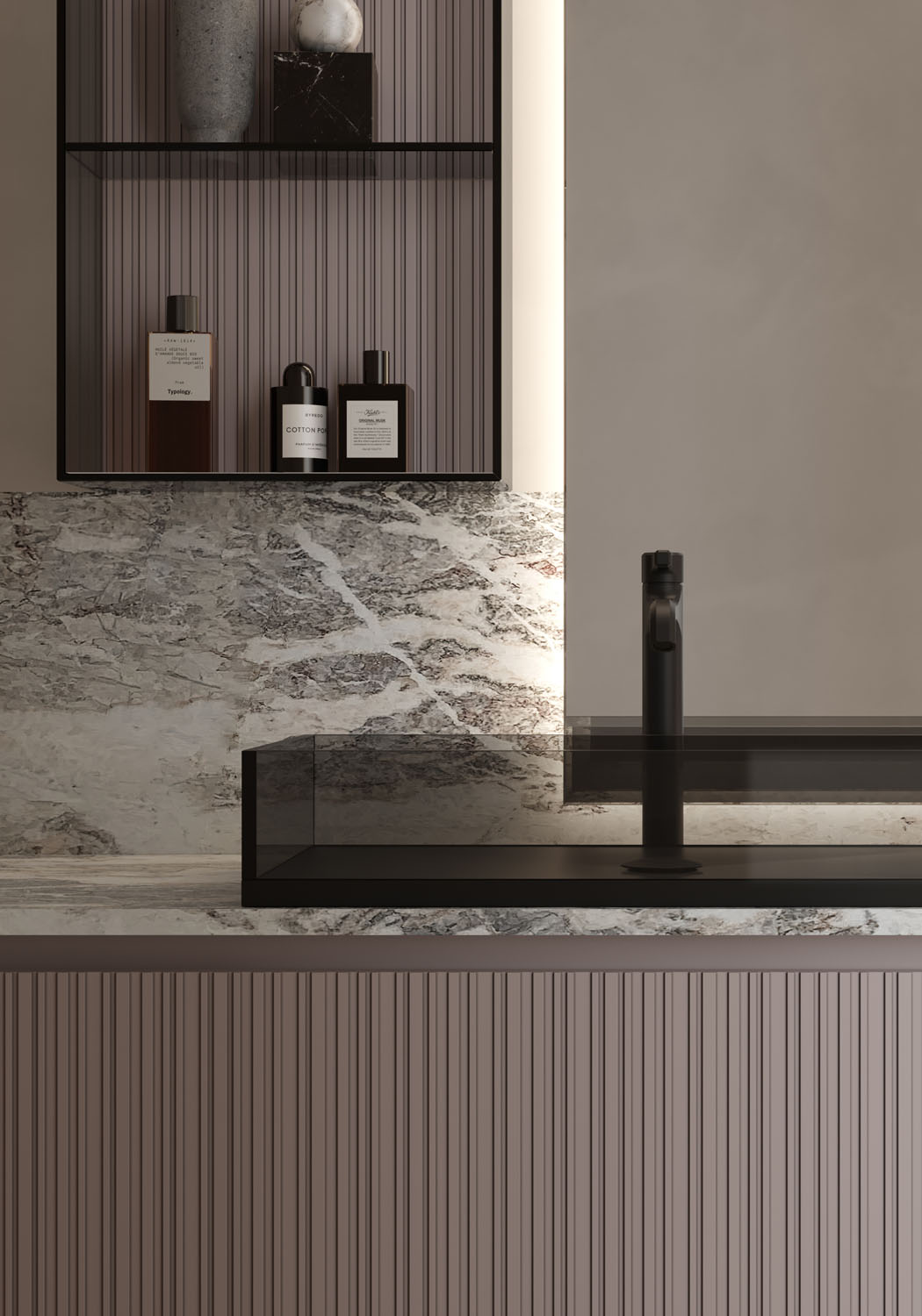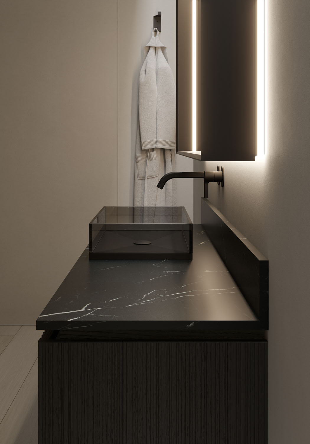 Rectangular countertop washbasin in glossy tinted glass with a matt black glass bottom, without overflow. Available in two sizes (50cm or 65cm wide). Matching shelves and open shelving units available.