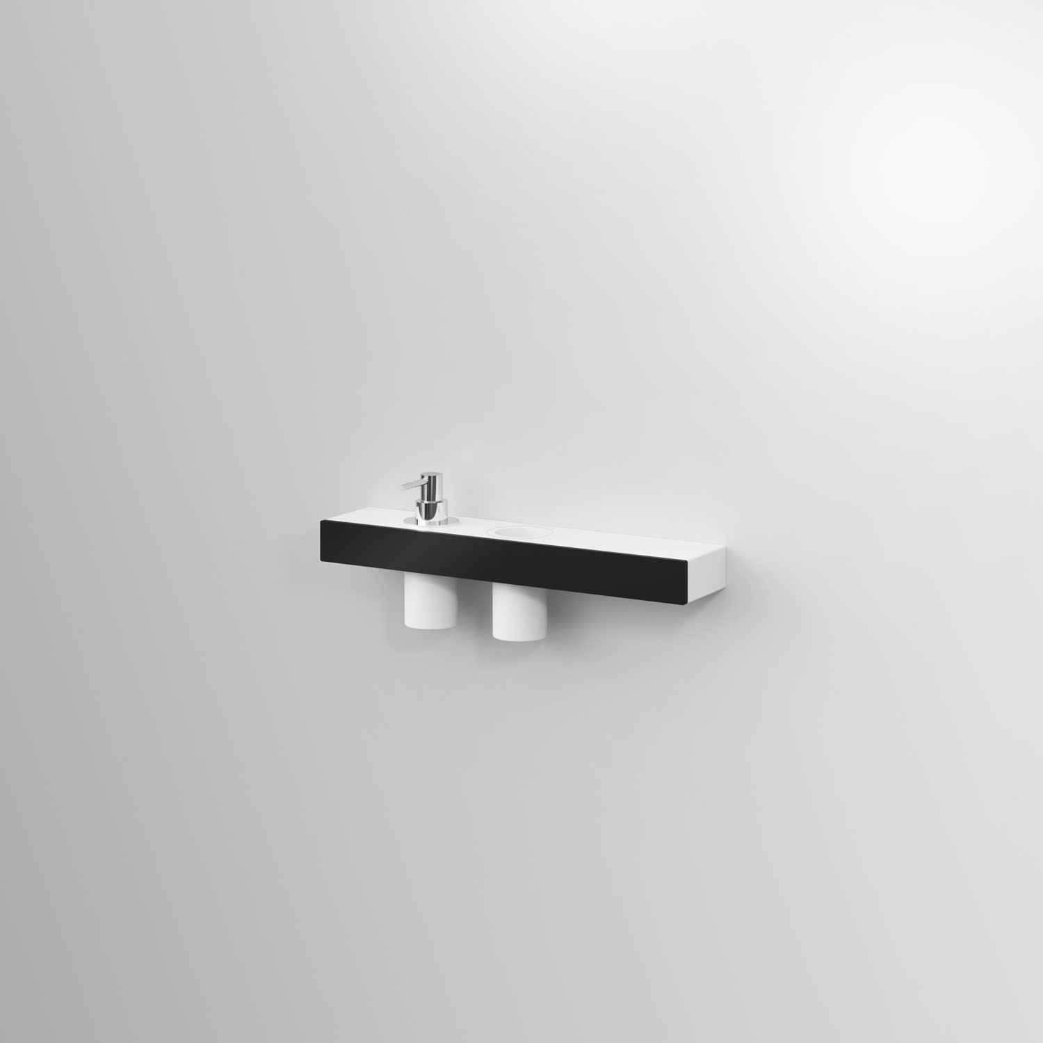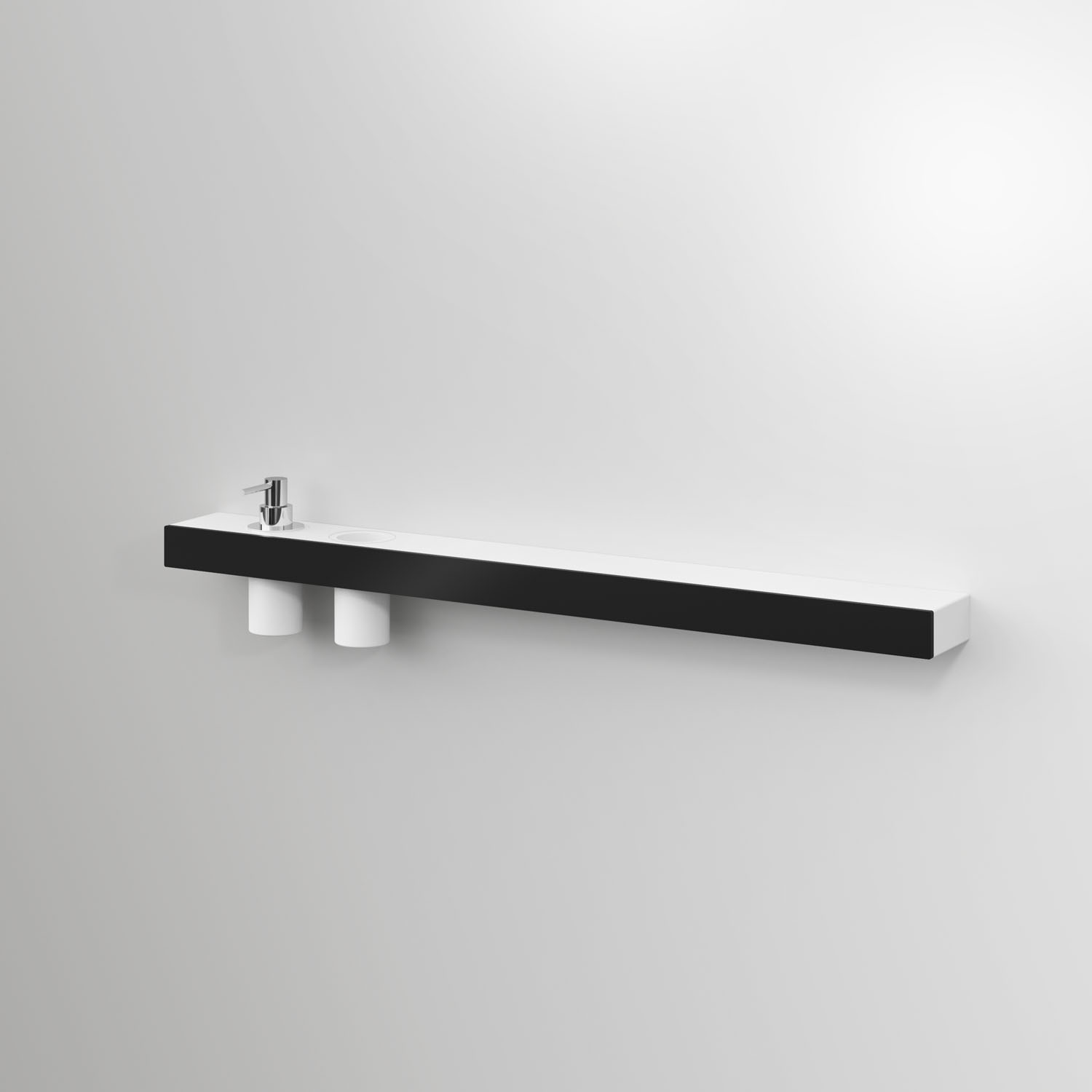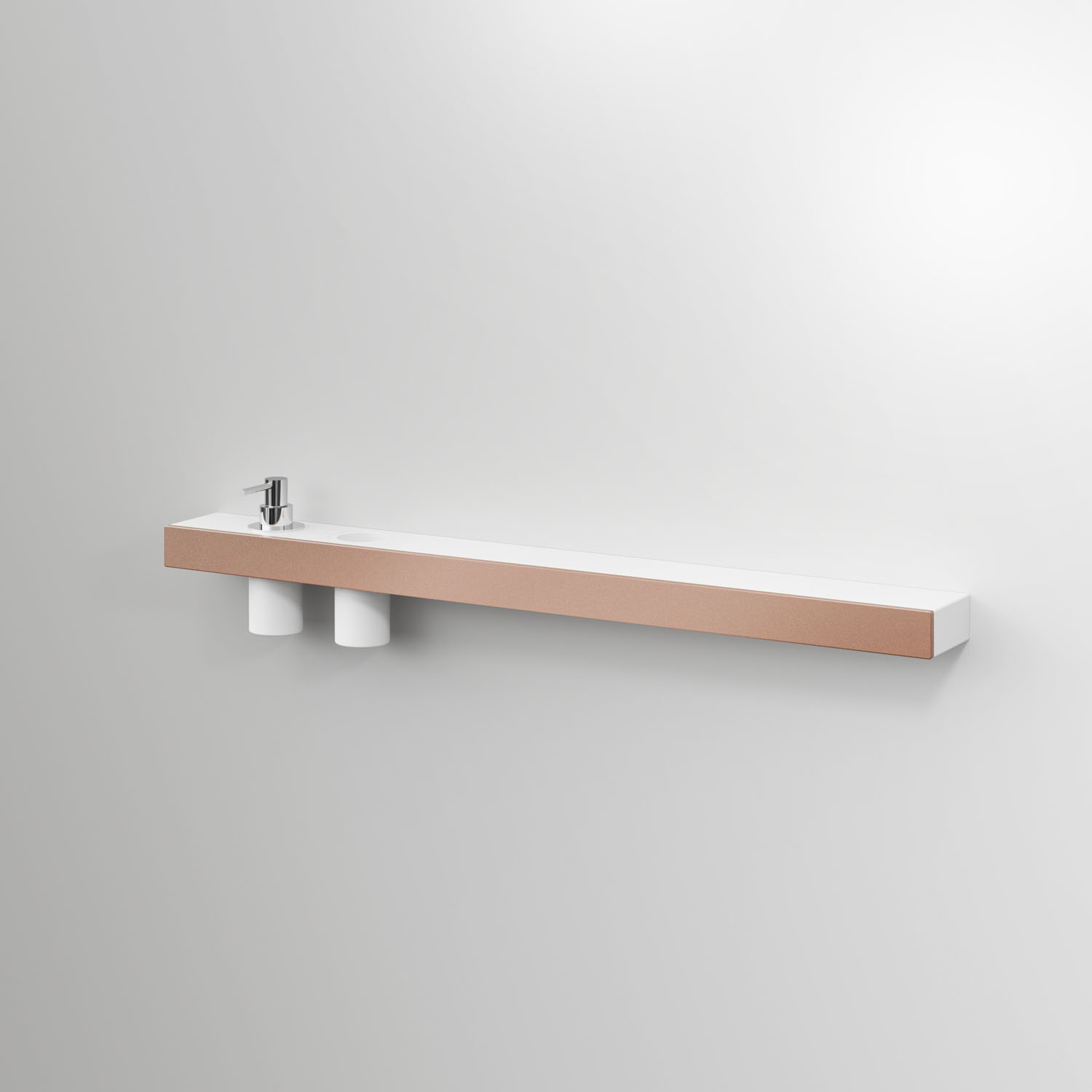 A line of aluminium wall-mounted accessories, available chrome finish as standard, or in any colour in the Ideagroup matt lacquer palette or Metal Color range (Rame, Titanio, Oro). These accessories (shelves, shelves with a soap dispenser/tumbler, towel holders, toilet roll holders) have an aluminium frame and can be finished with a matt white Acritek insert. They are removable, and are suitable for right or left-hand installation. The soap dispenser and free-standing toilet brush holder have a chrome finish.