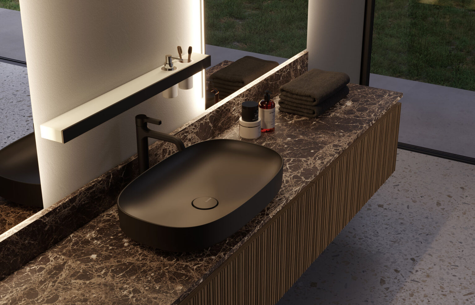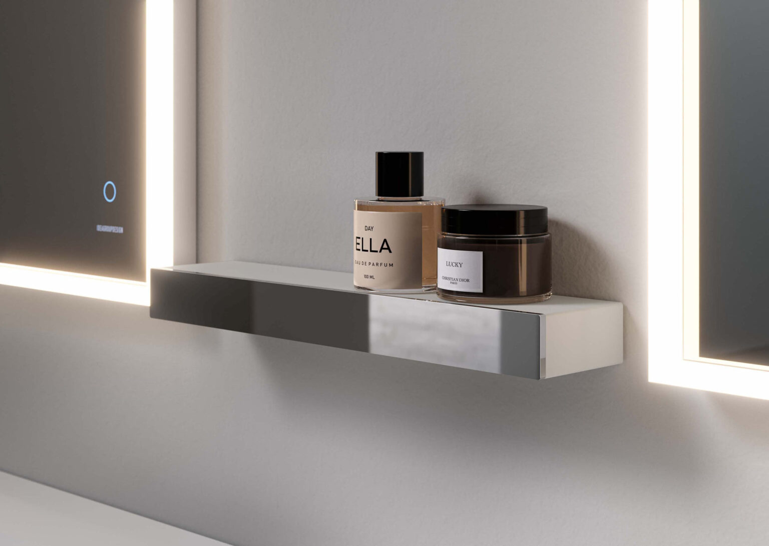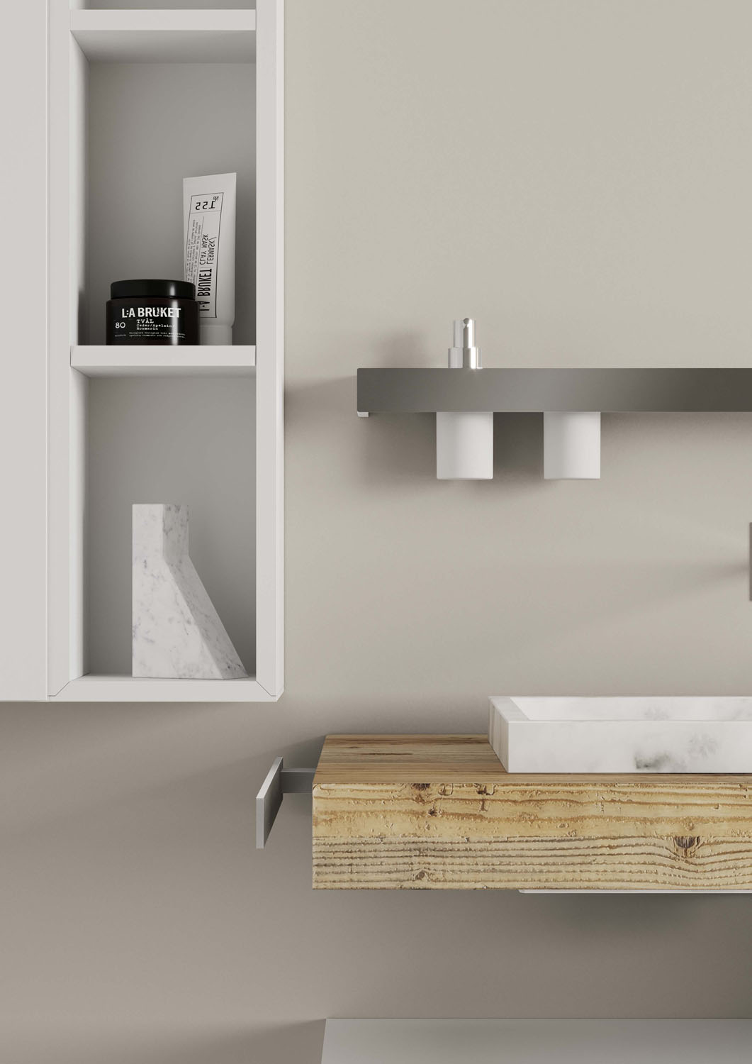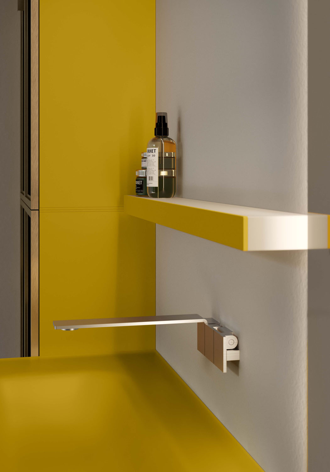 A line of aluminium wall-mounted accessories, available chrome finish as standard, or in any colour in the Ideagroup matt lacquer palette or Metal Color range (Rame, Titanio, Oro). These accessories (shelves, shelves with a soap dispenser/tumbler, towel holders, toilet roll holders) have an aluminium frame and can be finished with a matt white Acritek insert. They are removable, and are suitable for right or left-hand installation. The soap dispenser and free-standing toilet brush holder have a chrome finish.