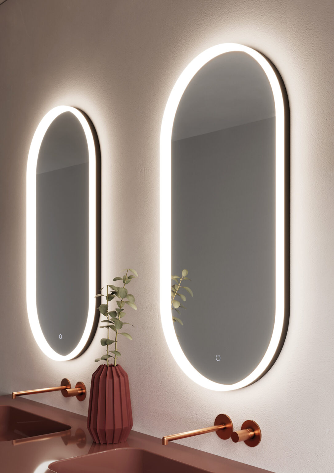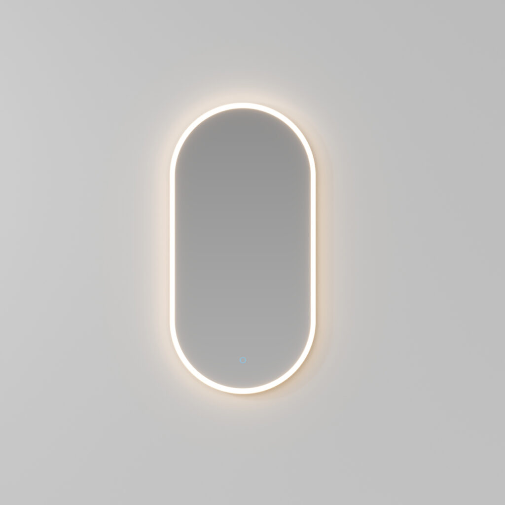 Nettuno mirror with edge lighting, touch ON/OFF switch and 2700/6000 K adjustable colour temperature. Designed for vertical mounting only. IP44 25 W – 2500 lm