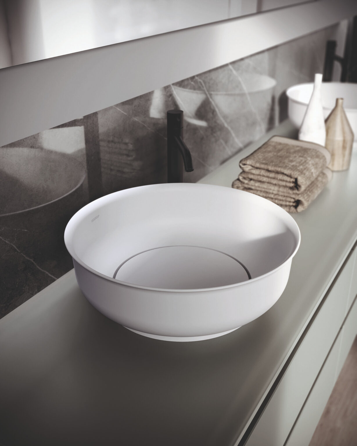 Mineralsolid/Mineralux washbasins are made of natural minerals (calcium carbonates and aluminium trihydrates) and polyester resins, with a polyester acrylate gelcoat surface that gives them a matt finish.