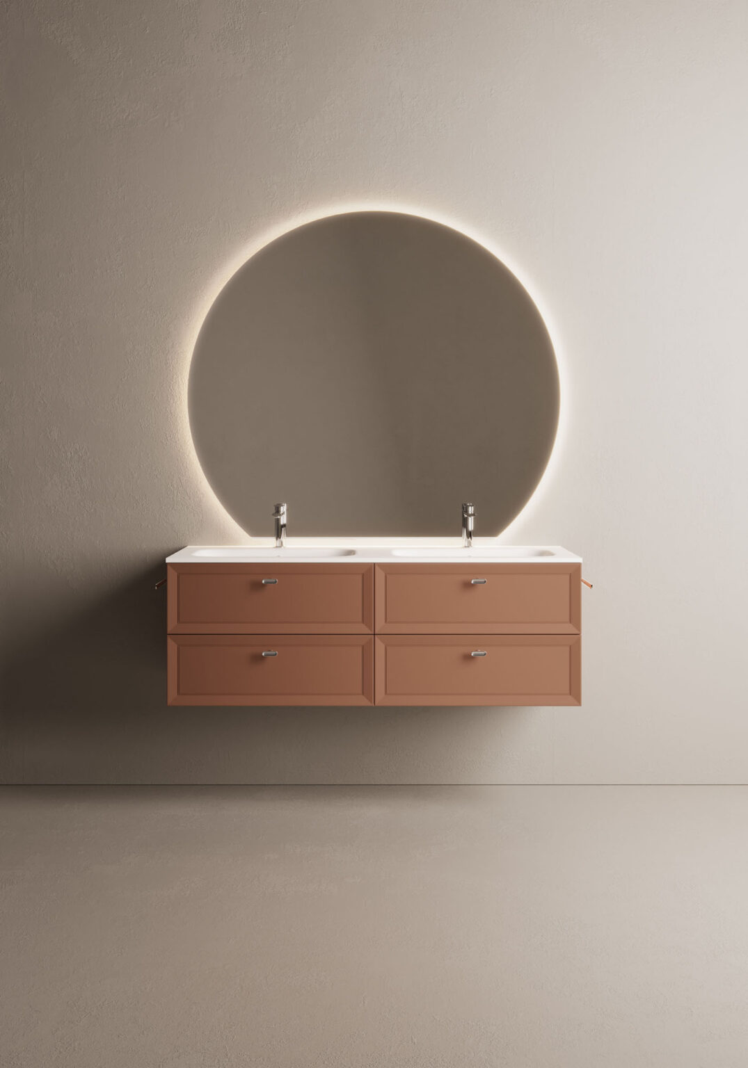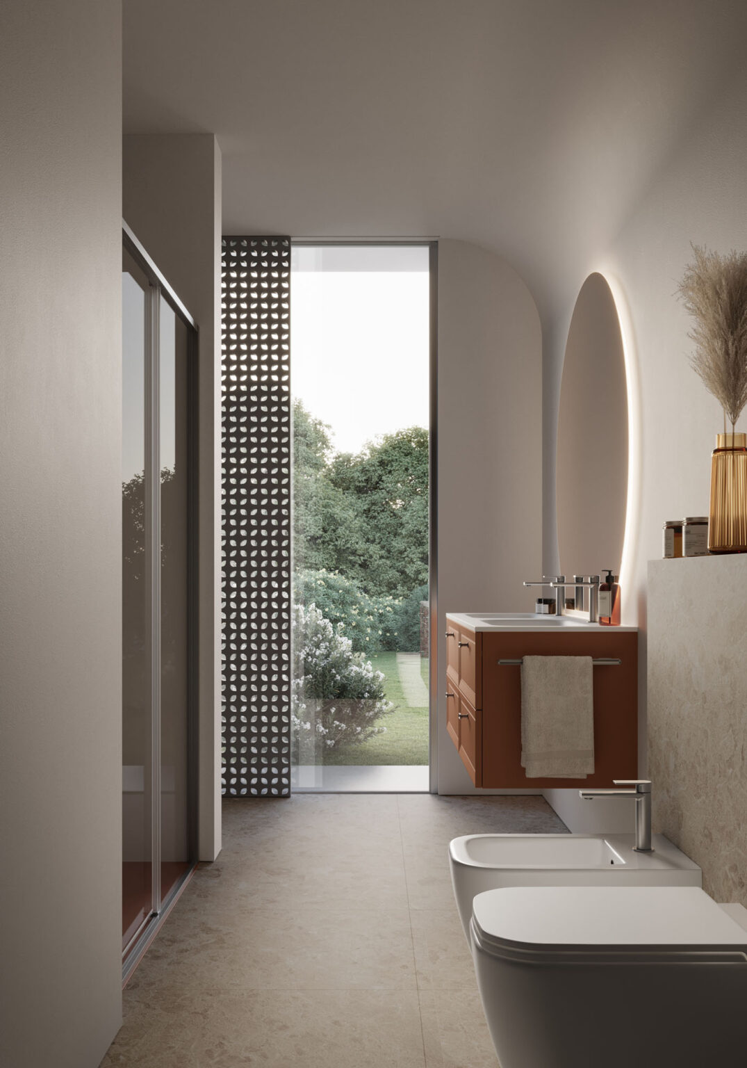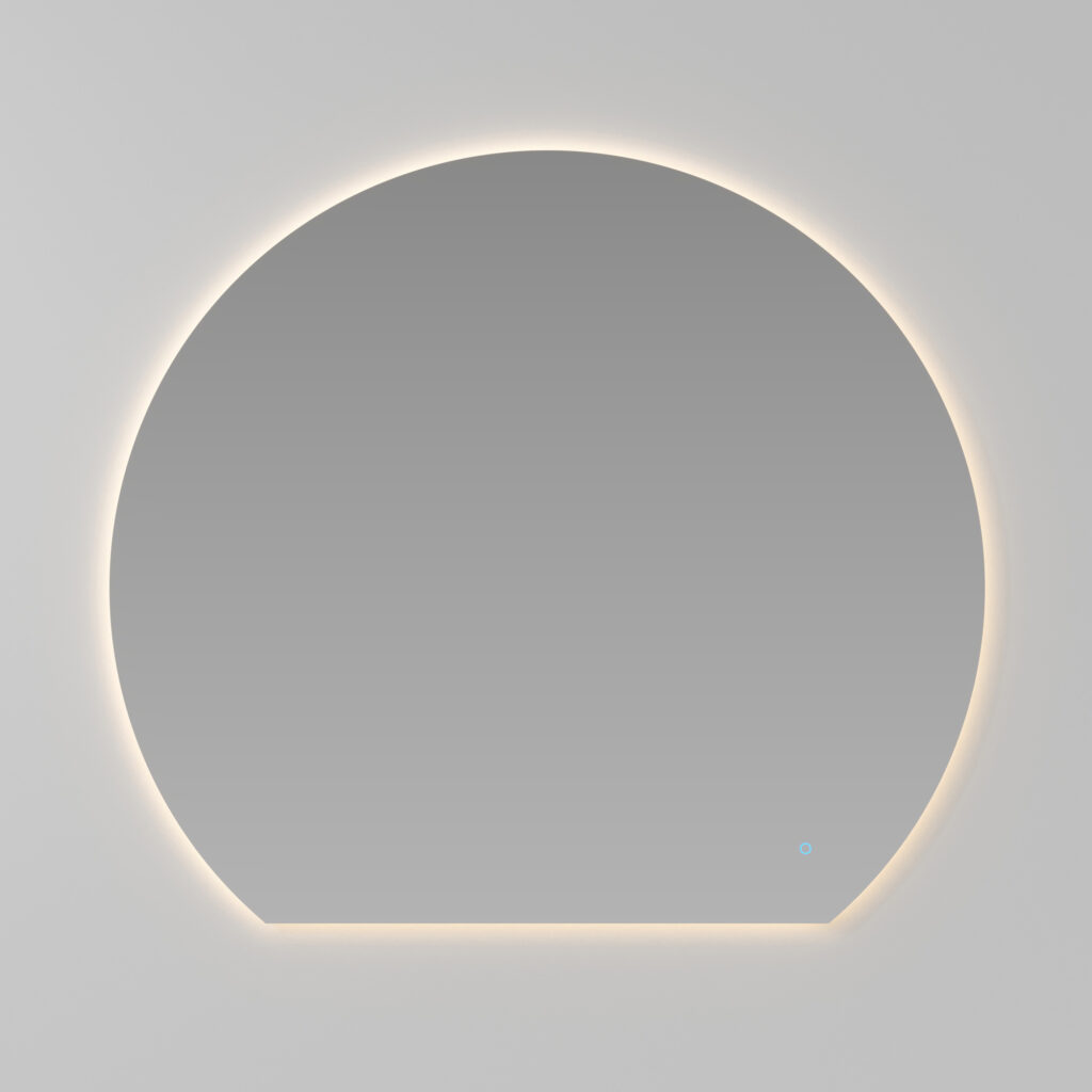 Platea mirror with a contoured shape and polished rounded edges. Complete with LED backlighting. IP55 – 3000/4000 K. Compatible with Arko 140 and Scarlet lights only. 30.1 W – 919 lm