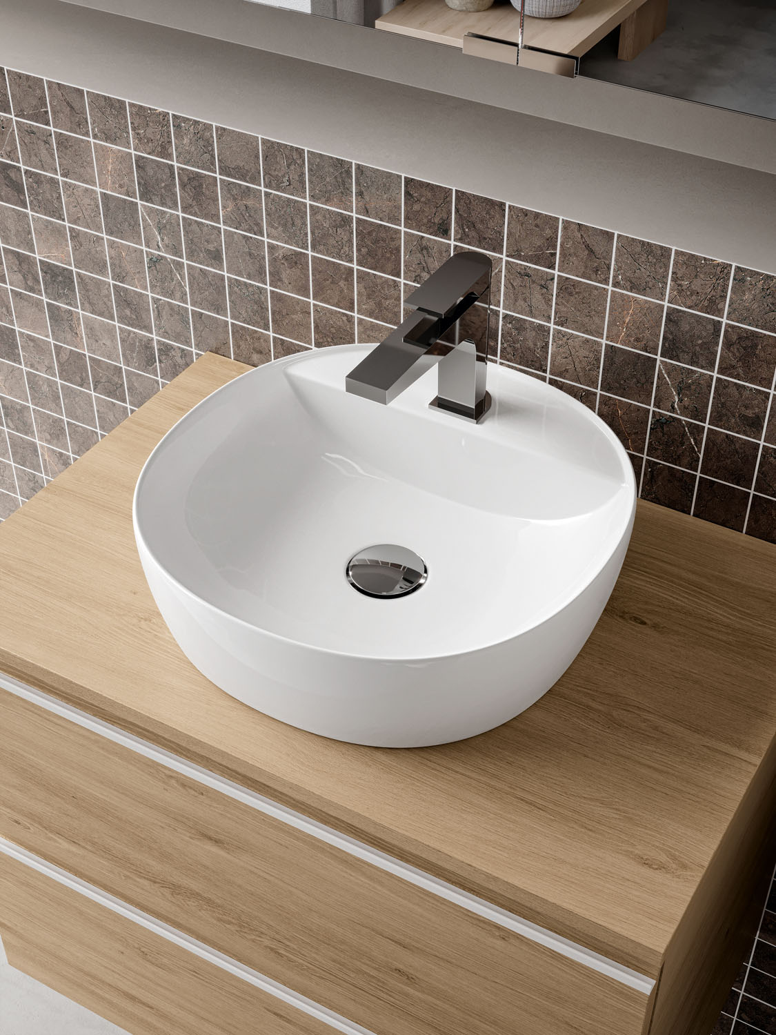 Sindy round countertop washbasin in glossy white ceramic. With tap hole, without overflow. Suitable for 45.5 cm deep straight countertops and for curved countertops.