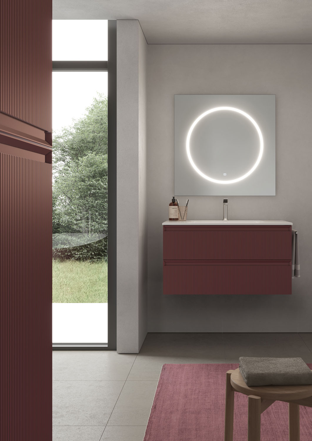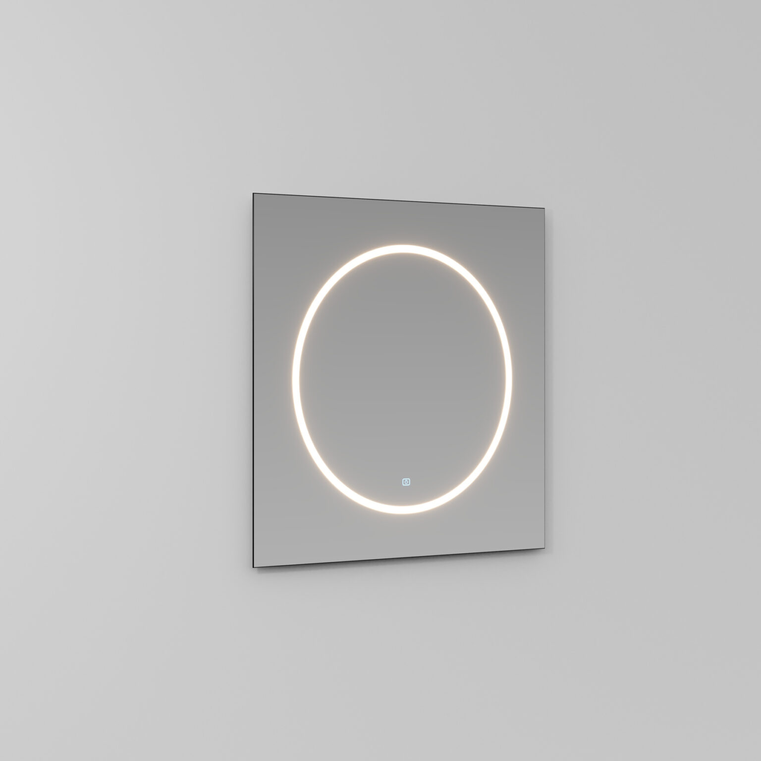 Square mirror with polished edges, with a luminous screen-printed circle. Available in a single size, with a built-in LED light integrated into the silk-screen printed circle. Touch ON/OFF switch and 2700/6000 K adjustable colour temperature.