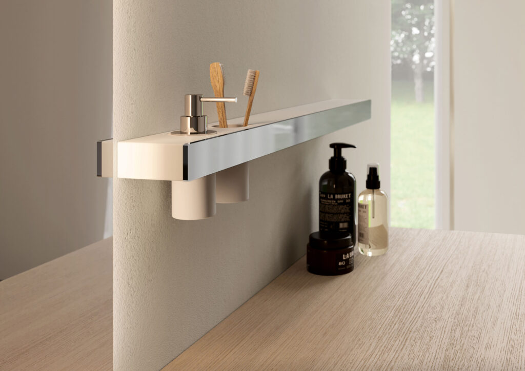 Modula is a new collection of modular wall accessories designed to add a touch of style to the bathroom with a balanced combination of elegance and functionality. All accessories – shelf, shelf with a soap dispenser and tumbler, towel rail and toilet roll holder – are made of aluminium and are available matt lacquered in any colour of the Ideagroup palette, or in Metal Colours (Rame, Titanio, Oro).