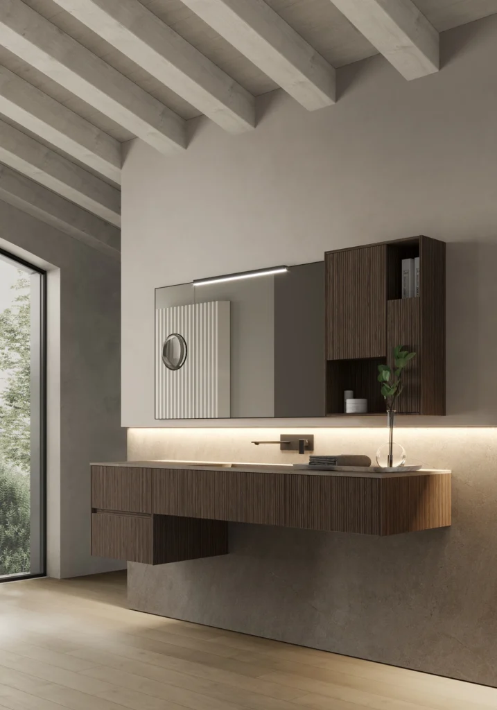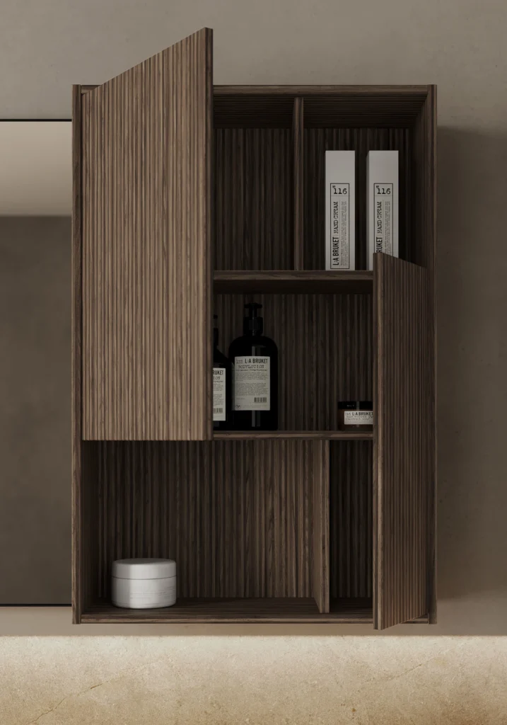 The Nyù collection is the epitome of elegant, understated bathroom furniture, blending sophisticated materials with evocative colours for a refined, classy bathroom aesthetic.