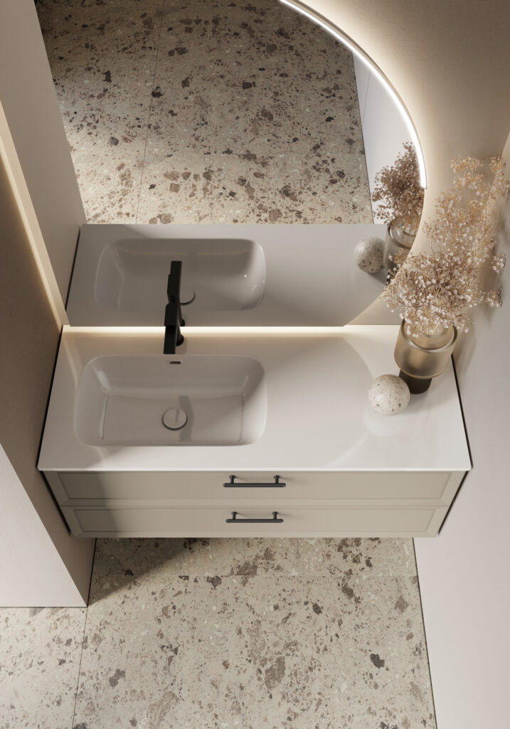 A distinctive stylish design element whereby a single countertop is characterised by different depths to match specific preferences and functional or space requirements (for example if a washing machine housing unit is to be fitted beneath the countertop). Split-depth countertops are available in all materials in the price list, except ceramic and polymer finishes.