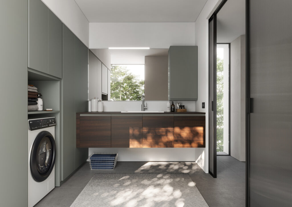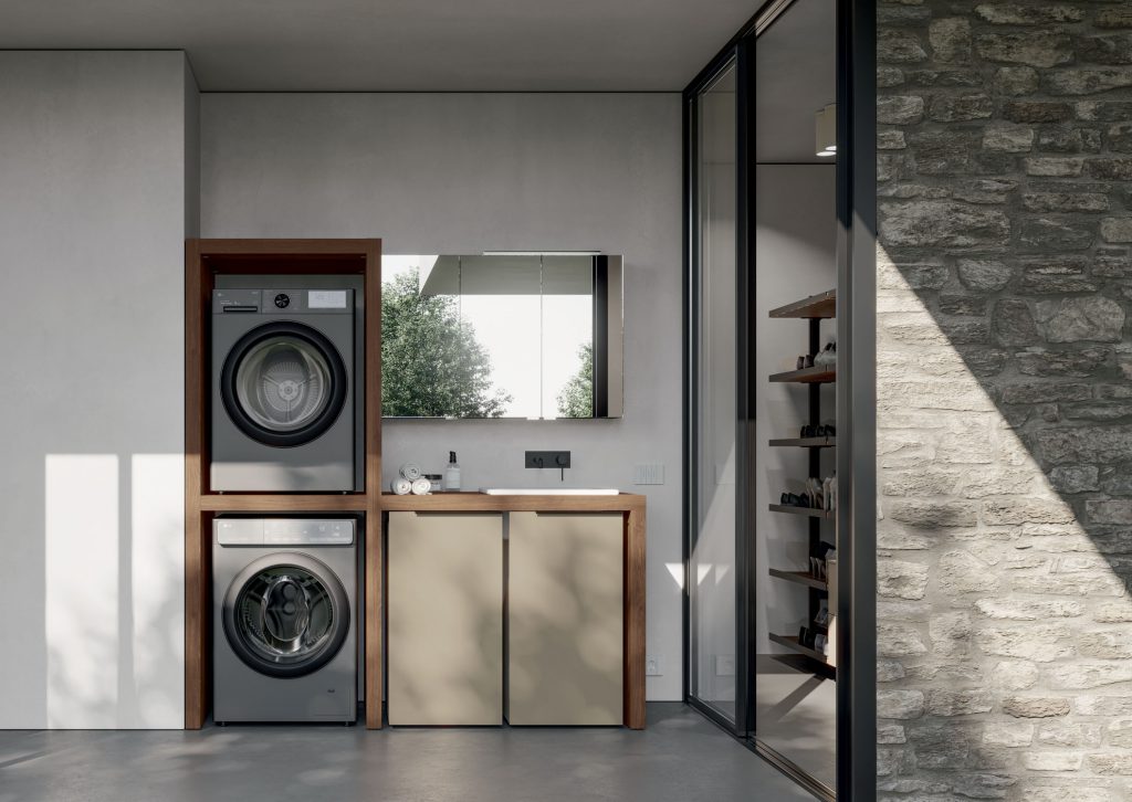 The Spazio Time collection integrates bathroom and laundry functions into a unified space, aligning with contemporary design trends. With 6cm-thick elements and wall shelving units, various rooms in the home can be customised to perfectly accommodate both space requirements and individual style preferences.
