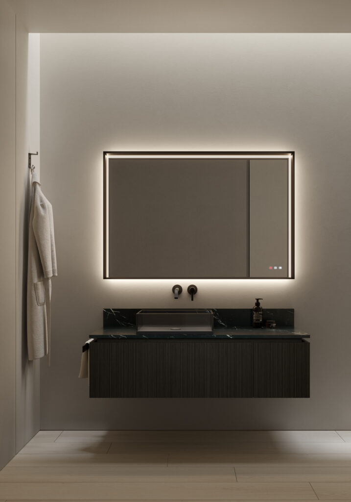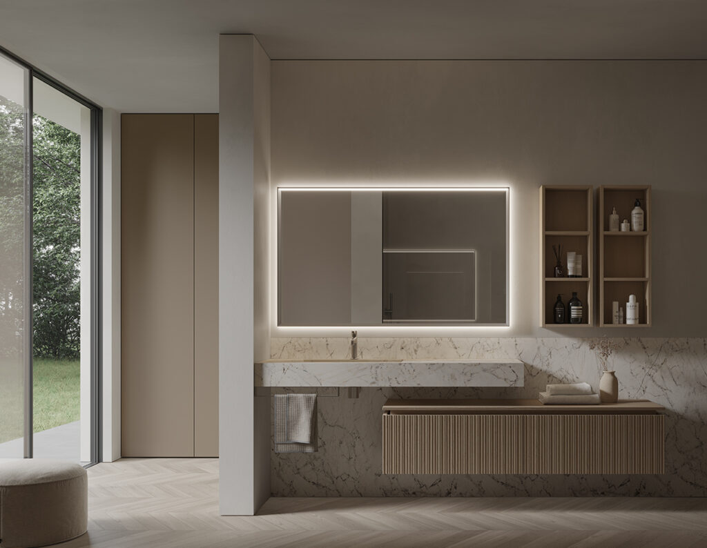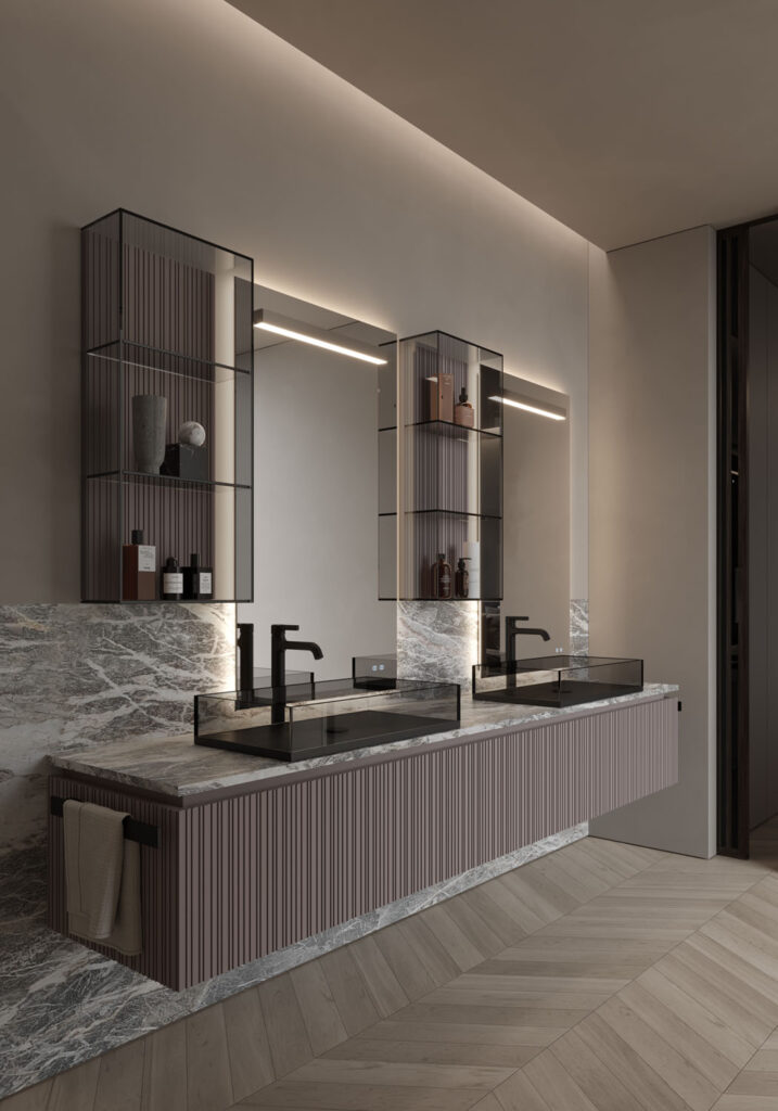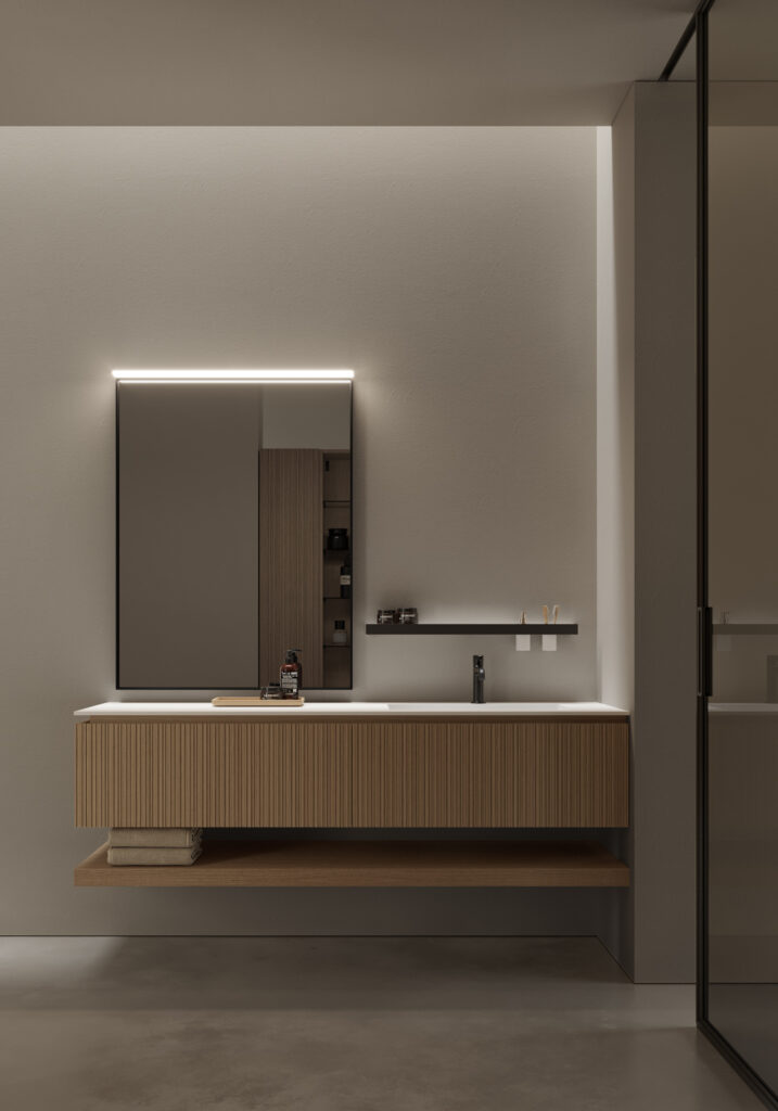 ViaCondotti is a bathroom furniture collection characterised by its sophisticated design. The collection features a distinctive vertical repeat pattern on both the fronts and sides of the cabinets, resulting in a dynamic and contemporary visual impact.